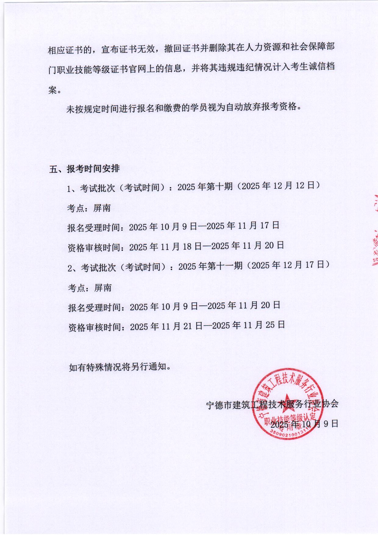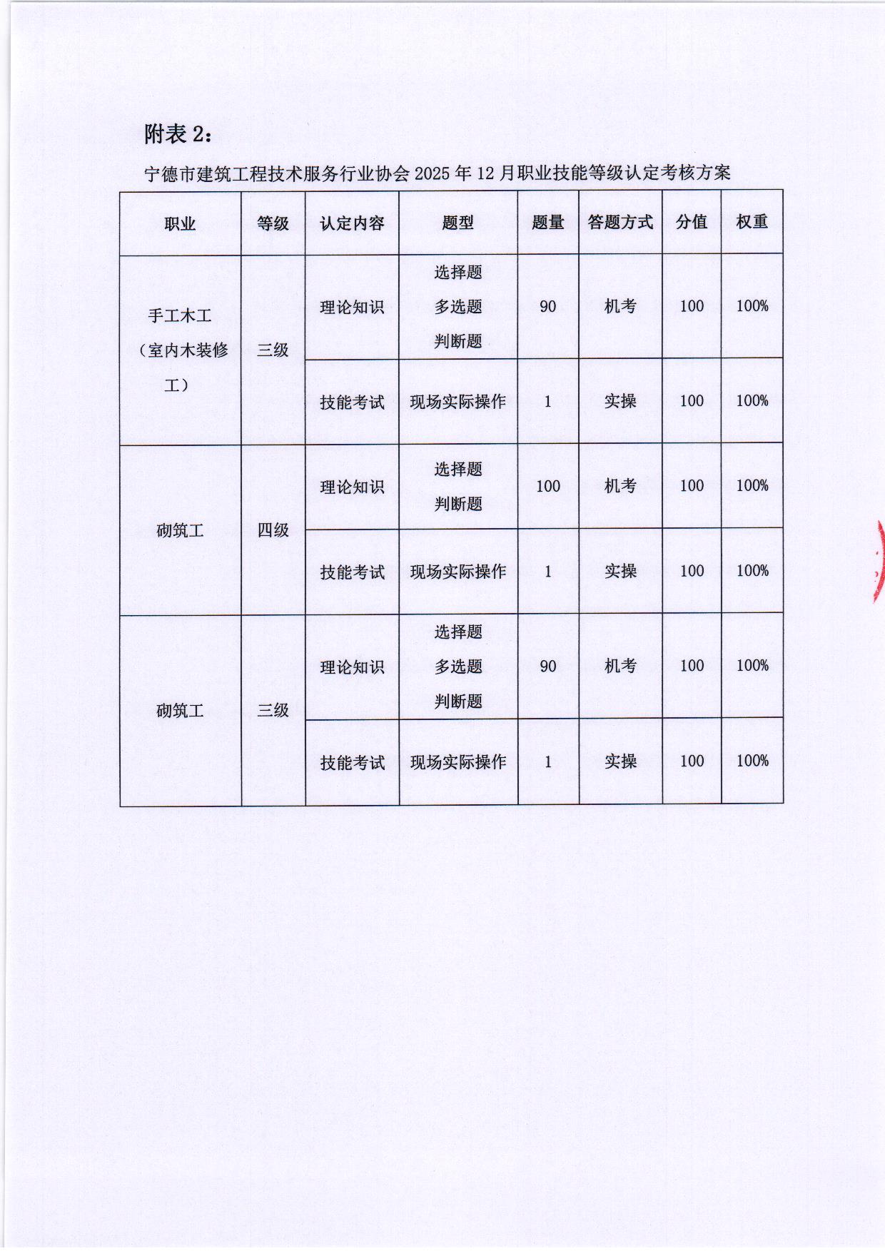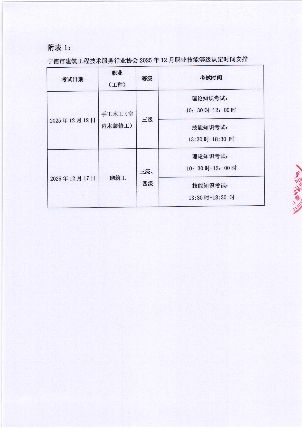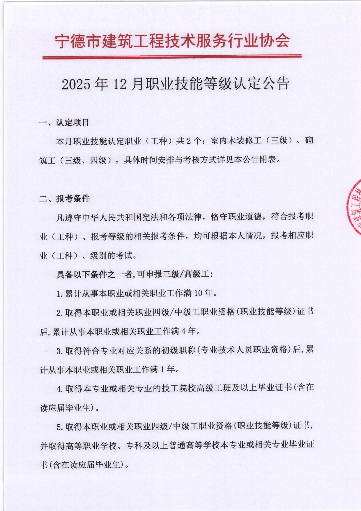 宁德市建筑工程技术服务行业协会2025年12月职业技能等级认定公告公示
