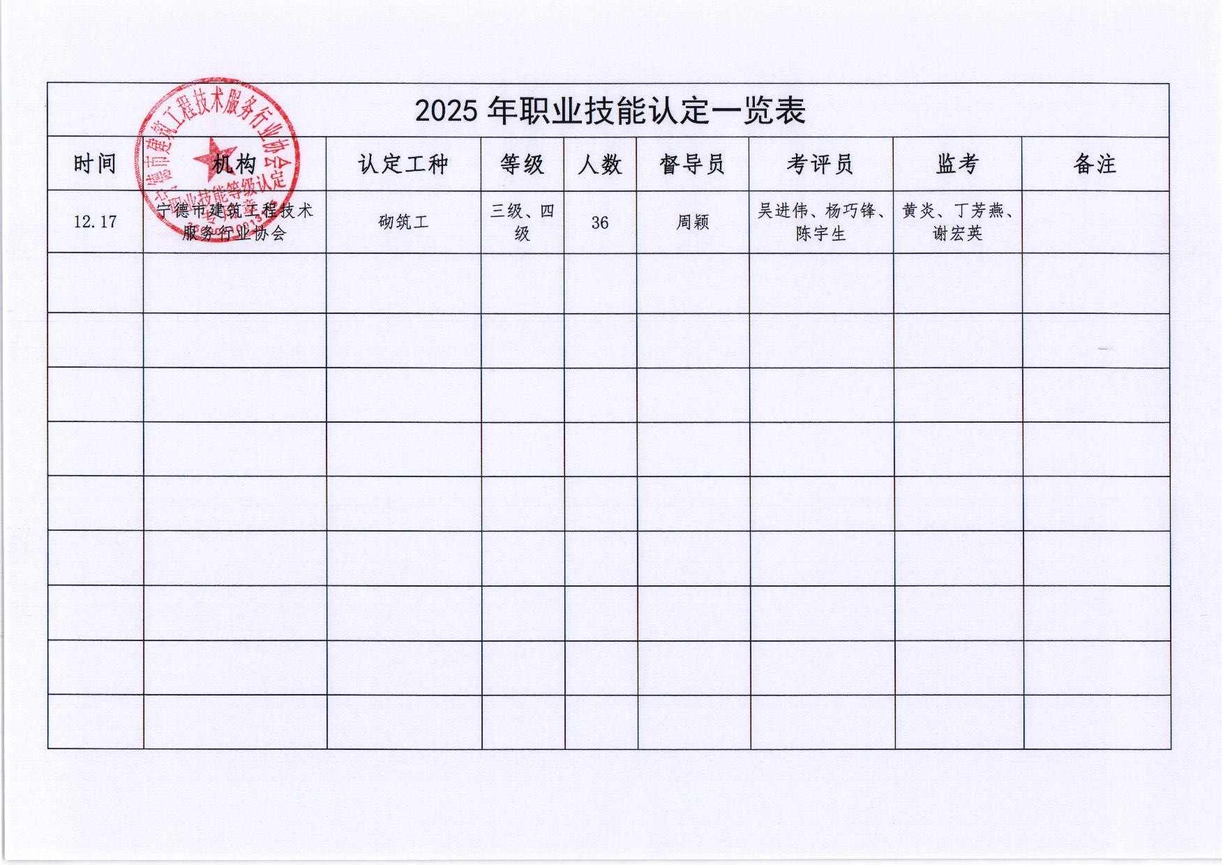 2025年12月17日职业技能等级认定一览表公示