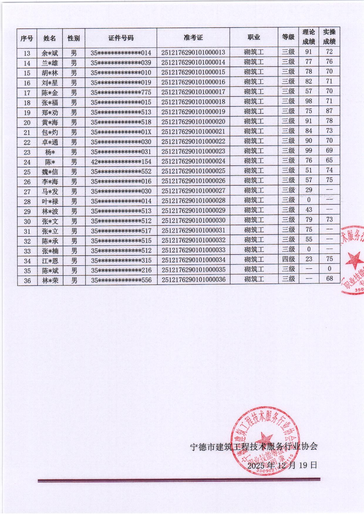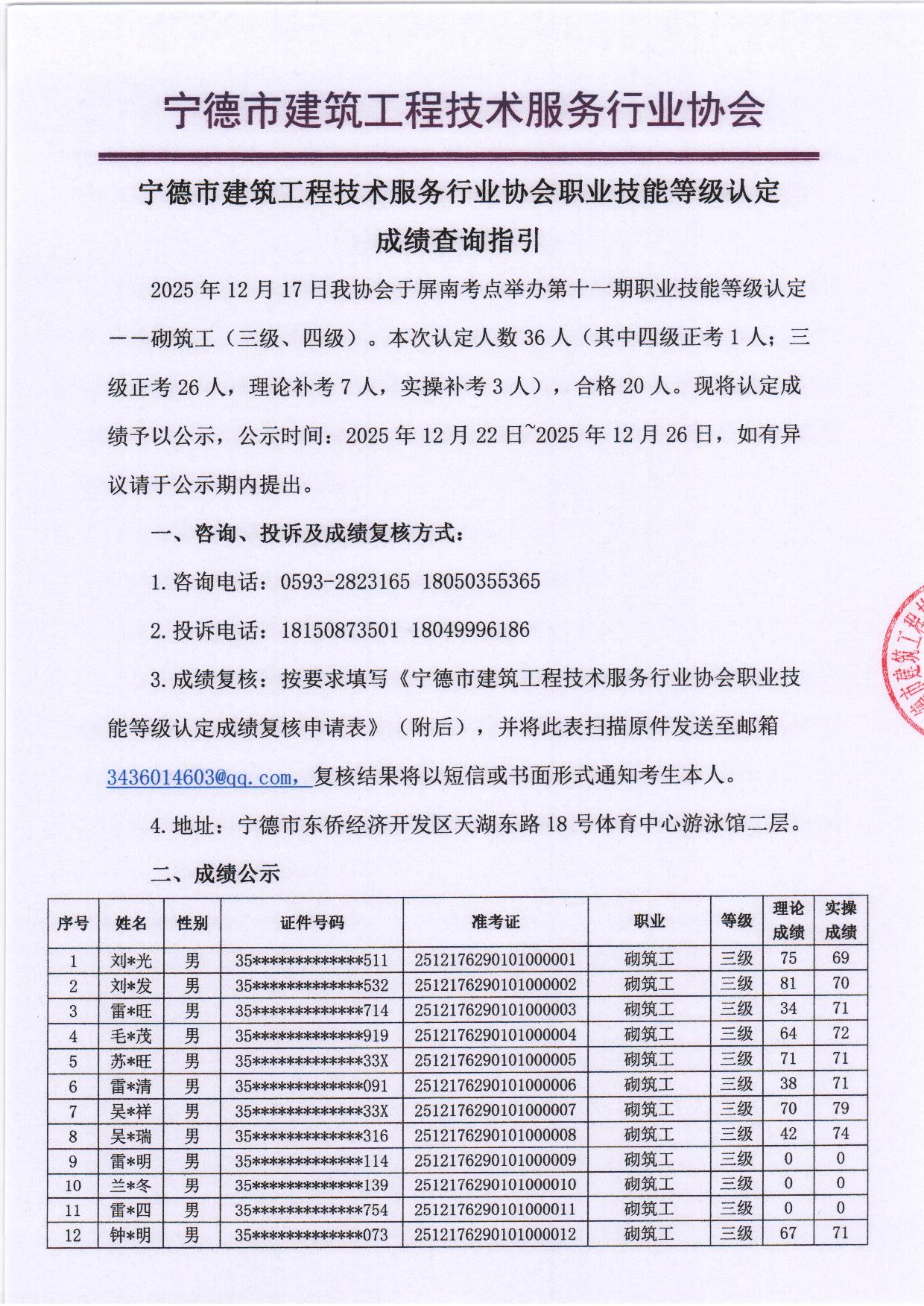 2025年12月17日第十一期砌筑工(三级、四级)职业技能等级认定成绩公示
