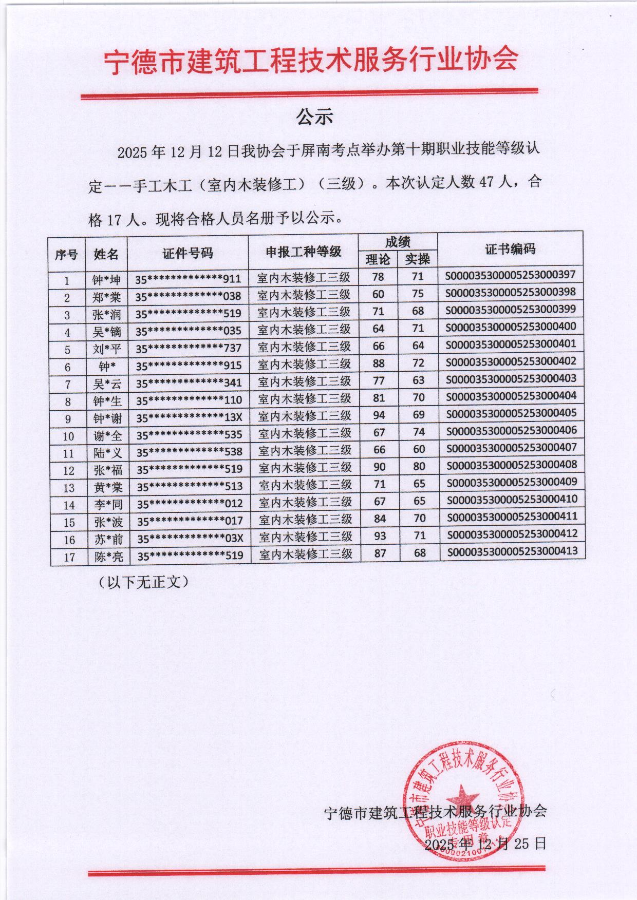 2025年12月12日第十期手工木工(室内木装修工)(三级)职业技能等级认定合格人员名册公示