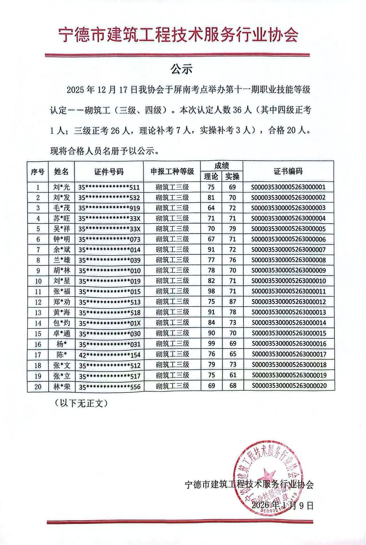 2025年12月17日第十一期砌筑工(三级、四级)职业技能等级认定合格人员名册公示
